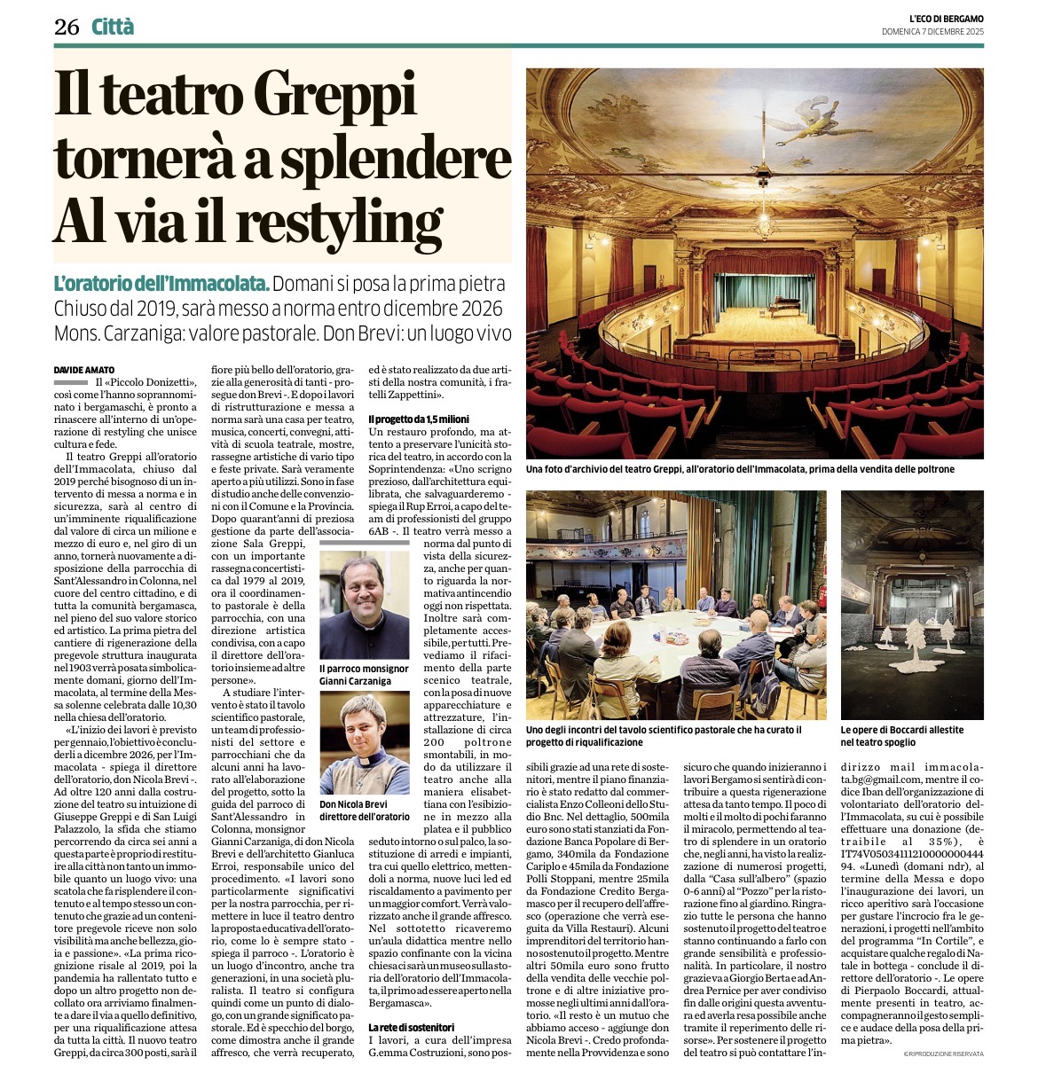 TEATRO SALA GREPPI CHIUSO PER RISTRUTTURAZIONE DAL 1/1/2020. I LAVORI SONO INIZIATI IL 1/1/2026 E SI CONCLUDERANNO, SALVO IMPREVISTI, IL 8/12/2026.